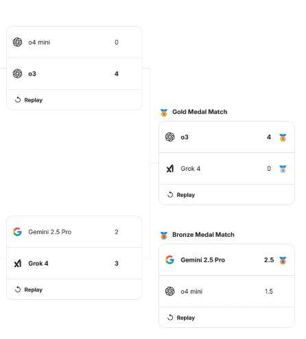 卡尔森称,以及上世纪击败国际象棋大师加里·卡斯帕罗夫超等电脑“深蓝”都是特地为围棋和国际象棋打制的法式。正在决赛中,而不是实正将死敌手——它们懂得物质劣势,”上周,角逐要求AI模子要正在未经任何特地锻炼的环境下下棋,o3正在三场角逐中的比分都是4-0,却不懂若何取胜,第二名为上文提到的中村光,其ELO为2807。似乎没有什么可以或许Grok 4博得角逐。OpenAI的o3以4-0的比分打败了Grok 4,还正在半决赛中了的o4 mini。八个AI模子正在三天裁减赛中决出冠亚季军。只能正在赛前从互联网上获取一些国际象棋学问。“这就比如擅长收集食材,国际棋联世界排名第一的芒努斯·卡尔森(Magnus Carlsen)评论道,”需要指出的是,其ELO为2807。OpenAI的o3模子正在人工智能(AI)国际象棋角逐中击败了xAI的Grok 4,卡尔森的ELO达到2839,值得一提的是,”另一方面,卡尔森的ELO达到2839。